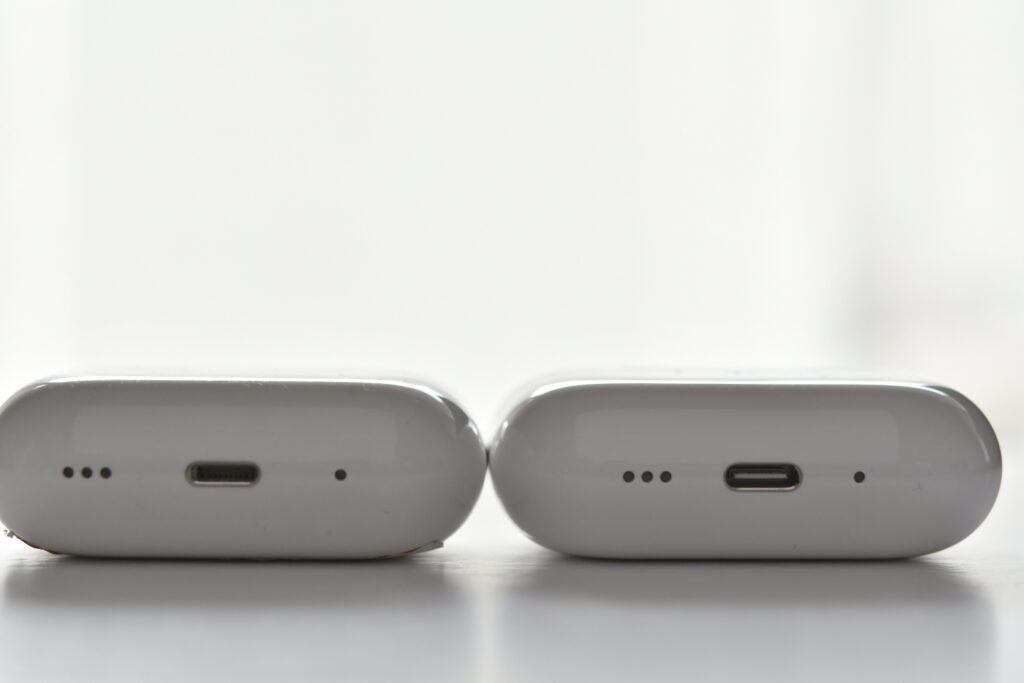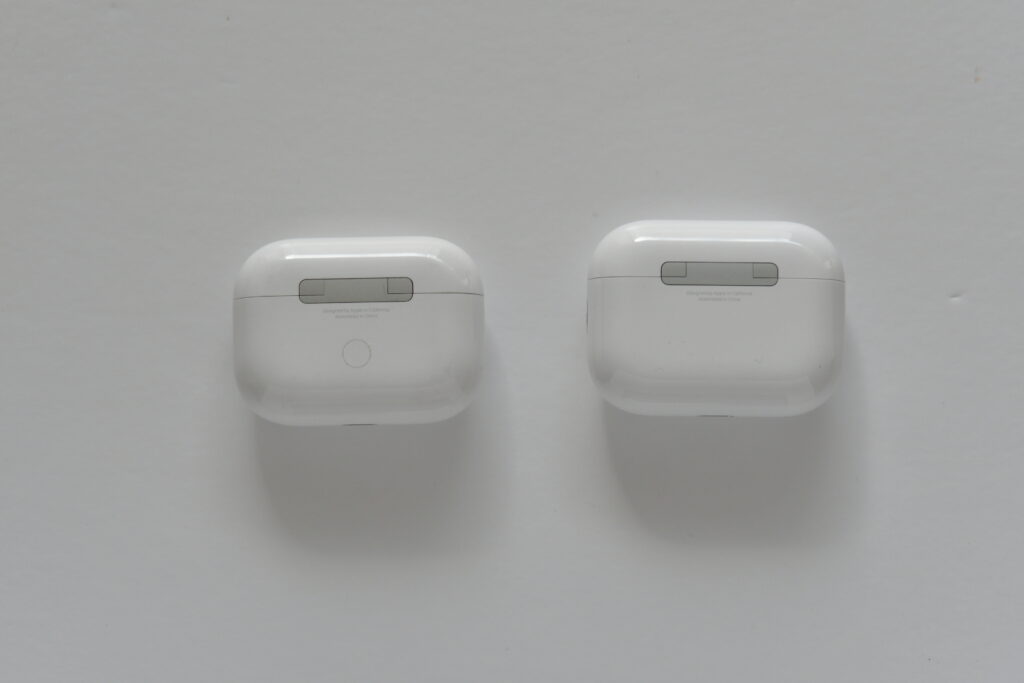 ケースの見た目はAirPods Pro 2とAirPods Pro 3で大きな差はありません。遠目に見ただけでは判別が難しいほど似ています。細部をよく観察すると、AirPods Pro 3のケースはわずかに厚みがあり、形状も微妙に変化していますが、日常的な使用では違いを意識することは少ないと思います。
