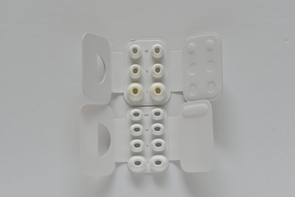 上がAirPods Pro 2のイヤーチップセット、下がAirPods Pro 3のイヤーチップセット、XXSが増えています。Mサイズは本体に装着済み。