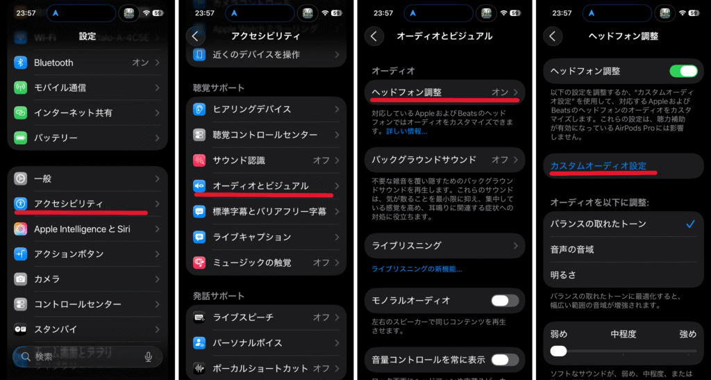 音質に関しては、以前からある機能で、好みの音質を作ることができます。私は、これで高音重視の設定をしています。「AirPodsProでこんな音が出せるのか」と感心します。ほとんどの人がやった方がよいとおもいます。